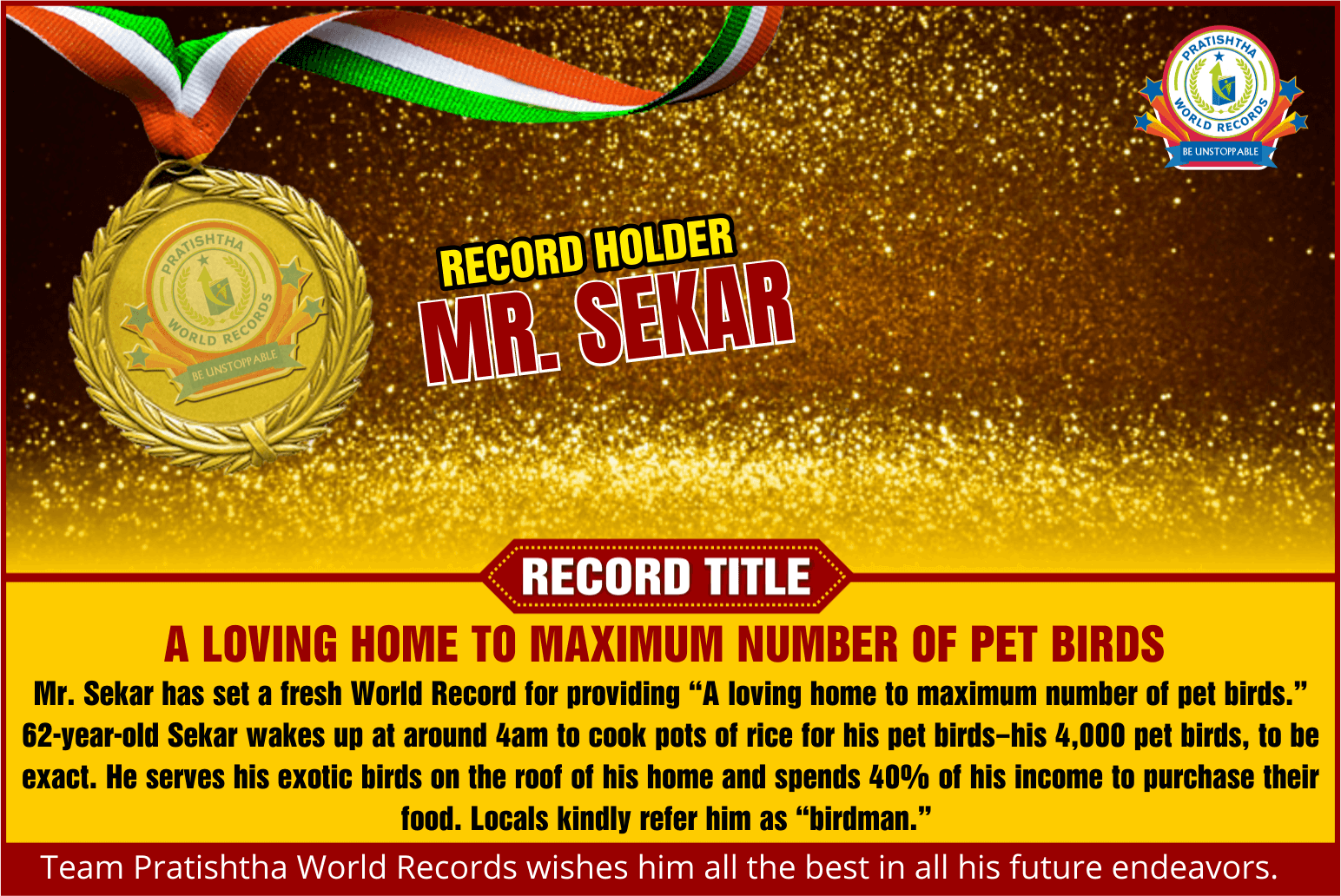 Record Detail: Mr. Sekar has set a fresh World Record for providing “A loving home to maximum number of pet birds.” 62-year-old Sekar wakes up at around 4am to cook pots of rice for his pet birds–his 4,000 pet birds, to be exact. He serves his exotic birds on the roof of his home and spends 40% of his income to purchase their food. Locals kindly refer him as “birdman.” We would like to wholeheartedly appreciate this jaw-breaking achievement of Mr. Sekar.