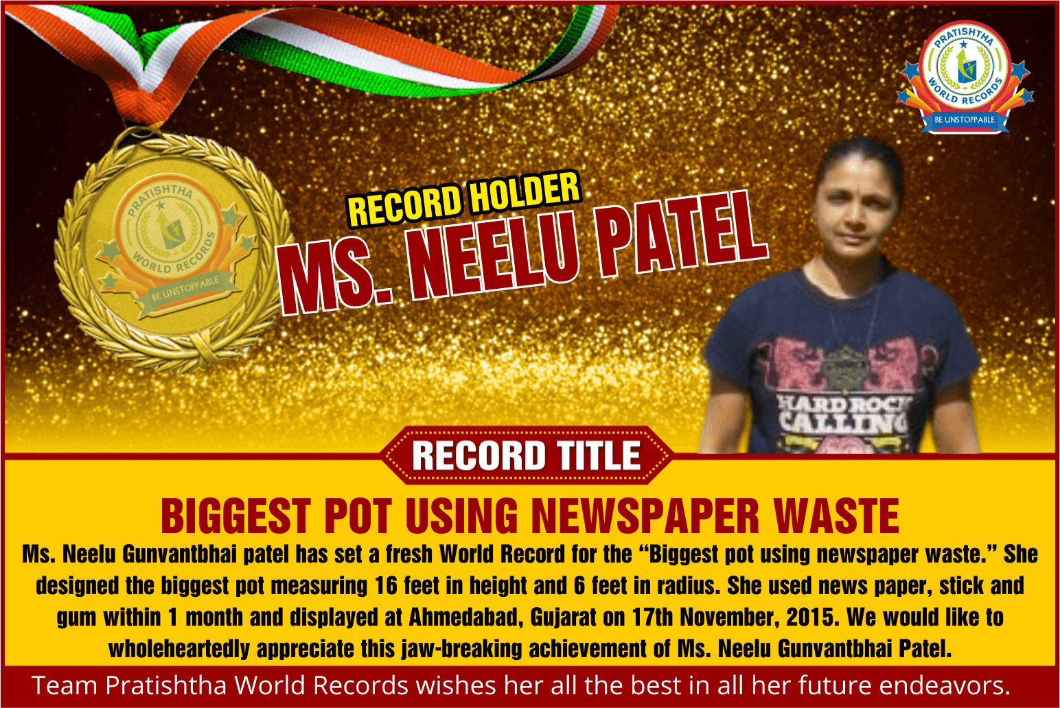 Record Detail: Ms. Neelu Gunvantbhai Patel has set a fresh World Record for the “Biggest pot using newspaper waste.” She designed the biggest pot measuring 16 feet in height and 6 feet in radius. She used newspaper, stick, and gum within 1 month and displayed them at Ahmedabad, Gujarat on 17th November 2015. We would like to wholeheartedly appreciate this jaw-breaking achievement of Ms. Neelu Gunvantbhai Patel.