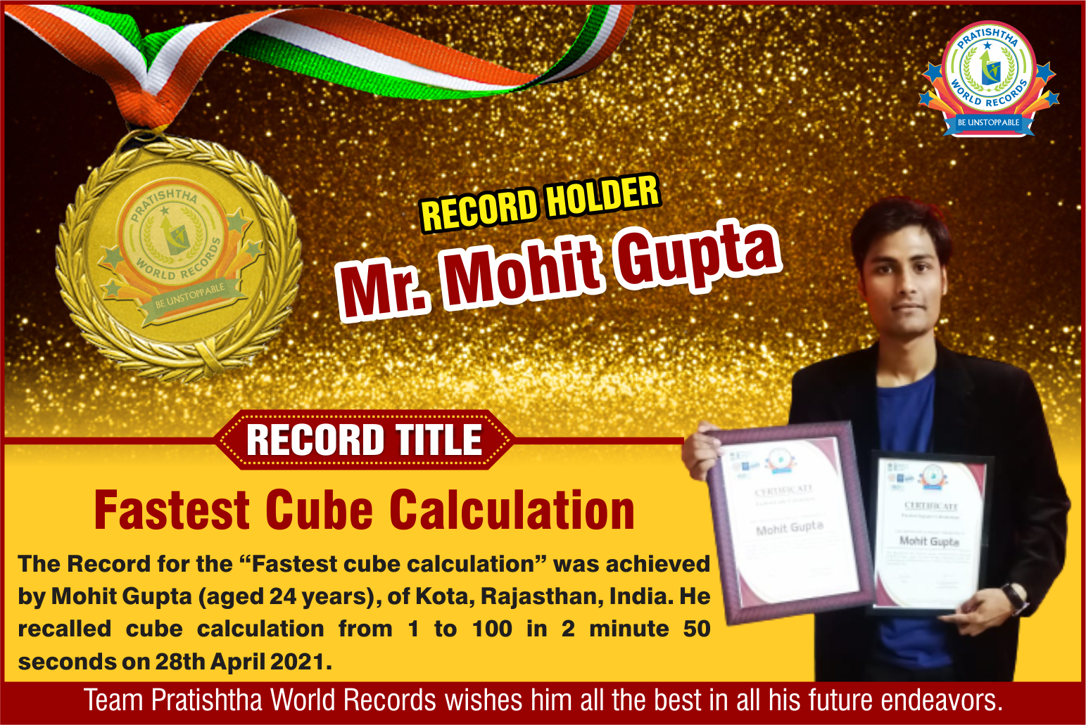 Record Detail:Mr. Mohit Gupta (24) from Kota, Rajasthan has set a fresh National Record for the “Fastest cube calculations.” He recalled cubes from 1 to 100 in 2min 50sec as confirmed on 28/04/2021. We would like to wholeheartedly appreciate this jaw-breaking achievement of Mr. Mohit Gupta.