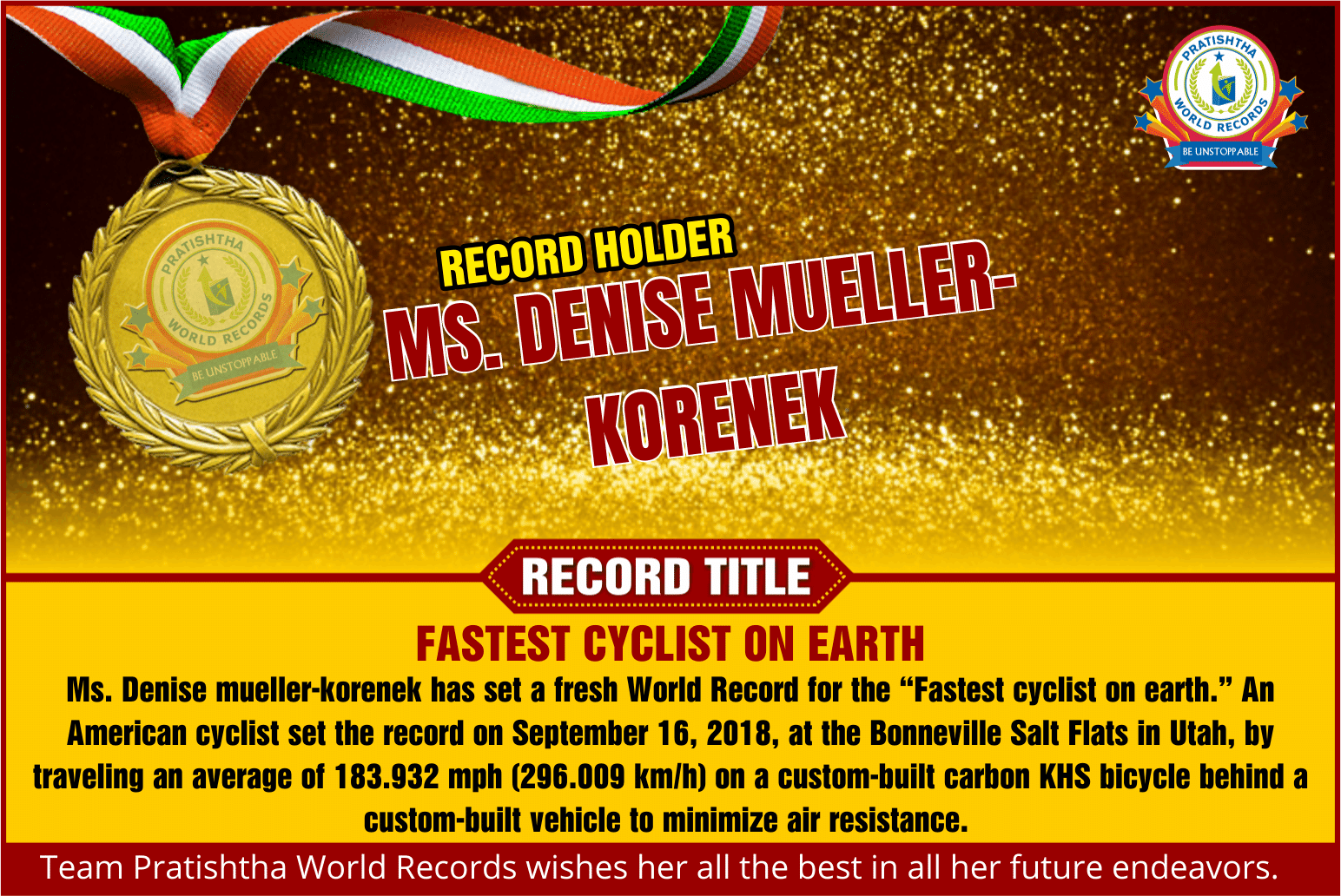 Record Detail: Ms. Denise mueller-korenek has set a fresh World Record for the “Fastest cyclist on earth.” An American cyclist set the record on September 16, 2018, at the Bonneville Salt Flats in Utah, by traveling an average of 183.932 mph (296.009 km/h) on a custom-built carbon KHS bicycle behind a custom-built vehicle to minimize air resistance. We would like to wholeheartedly appreciate this jaw-breaking achievement of Ms. Denise mueller-korenek.