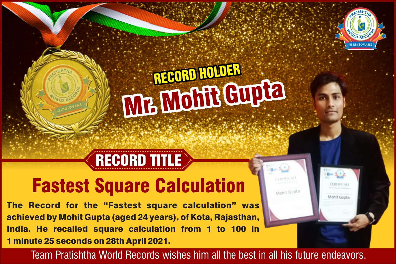 Record Detail: Mr. Mohit Gupta (24) from Kota, Rajasthan has set a fresh National Record for the “Fastest square calculation.” He recalled square calculation from 1 to 100 in 1min 25sec as confirmed on 28/04/2021. We would like to wholeheartedly appreciate this jaw-breaking achievement of Mr. Mohit Gupta.