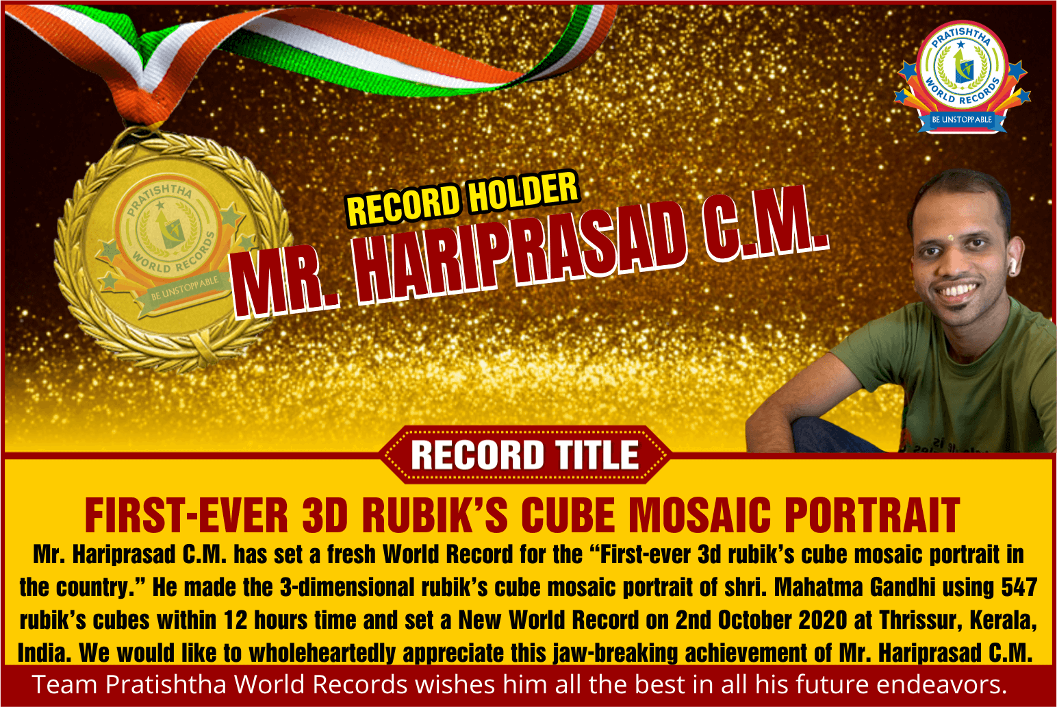 Record Detail: Mr. Hariprasad C.M. has set a fresh World Record for the “First-ever 3d rubik’s cube mosaic portrait in the country.” He made the 3-dimensional rubik’s cube mosaic portrait of shri. Mahatma Gandhi using 547 rubik’s cubes within 12 hours time and set a New World Record on 2nd October 2020 at Thrissur, Kerala, India. We would like to wholeheartedly appreciate this jaw-breaking achievement of Mr. Hariprasad C.M.