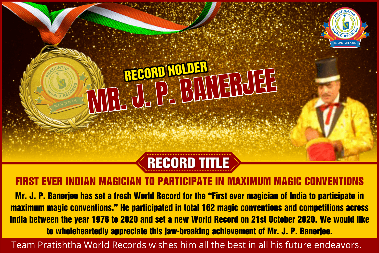 Record Detail: Mr. J. P. Banerjee has set a fresh World Record for the “First ever magician of India to participate in maximum magic conventions.” He participated in total 162 magic conventions and competitions across India between the year 1976 to 2020 and set a new World Record on 21st October 2020. We would like to wholeheartedly appreciate this jaw-breaking achievement of Mr. J. P. Banerjee.