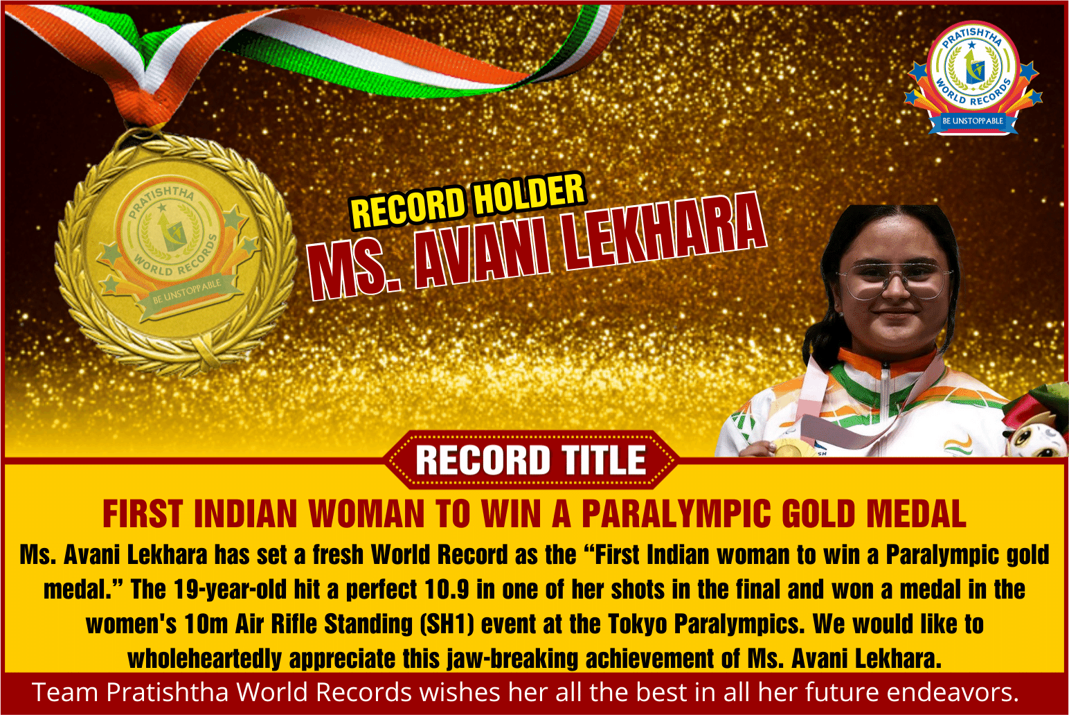 Record Detail: Ms. Avani Lekhara has set a fresh World Record as the “First Indian woman to win a Paralympic gold medal.” The 19-year-old hit a perfect 10.9 in one of her shots in the final and won a medal in the women’s 10m Air Rifle Standing (SH1) event at the Tokyo Paralympics. We would like to wholeheartedly appreciate this jaw-breaking achievement of Ms. Avani Lekhara.