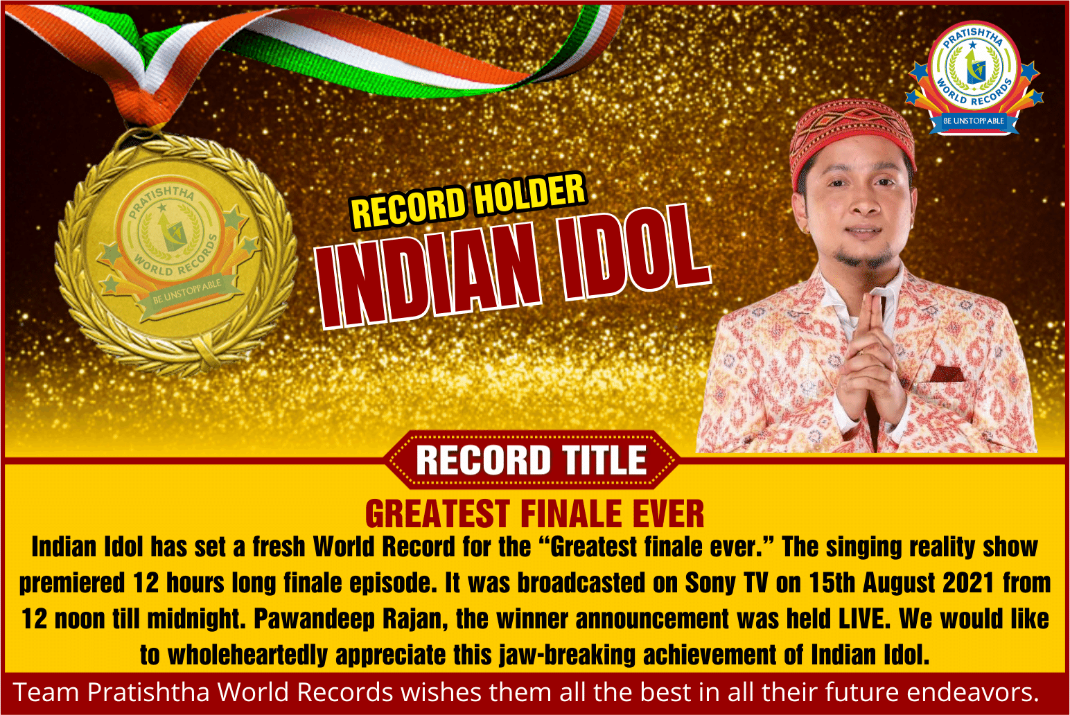 Record Detail: Indian Idol has set a fresh World Record for the “Greatest finale ever.” The singing reality show premiered 12 hours long finale episode. It was broadcasted on Sony TV on 15th August 2021 from 12 noon till midnight. Pawandeep Rajan, the winner announcement was held LIVE. We would like to wholeheartedly appreciate this jaw-breaking achievement of Indian Idol.