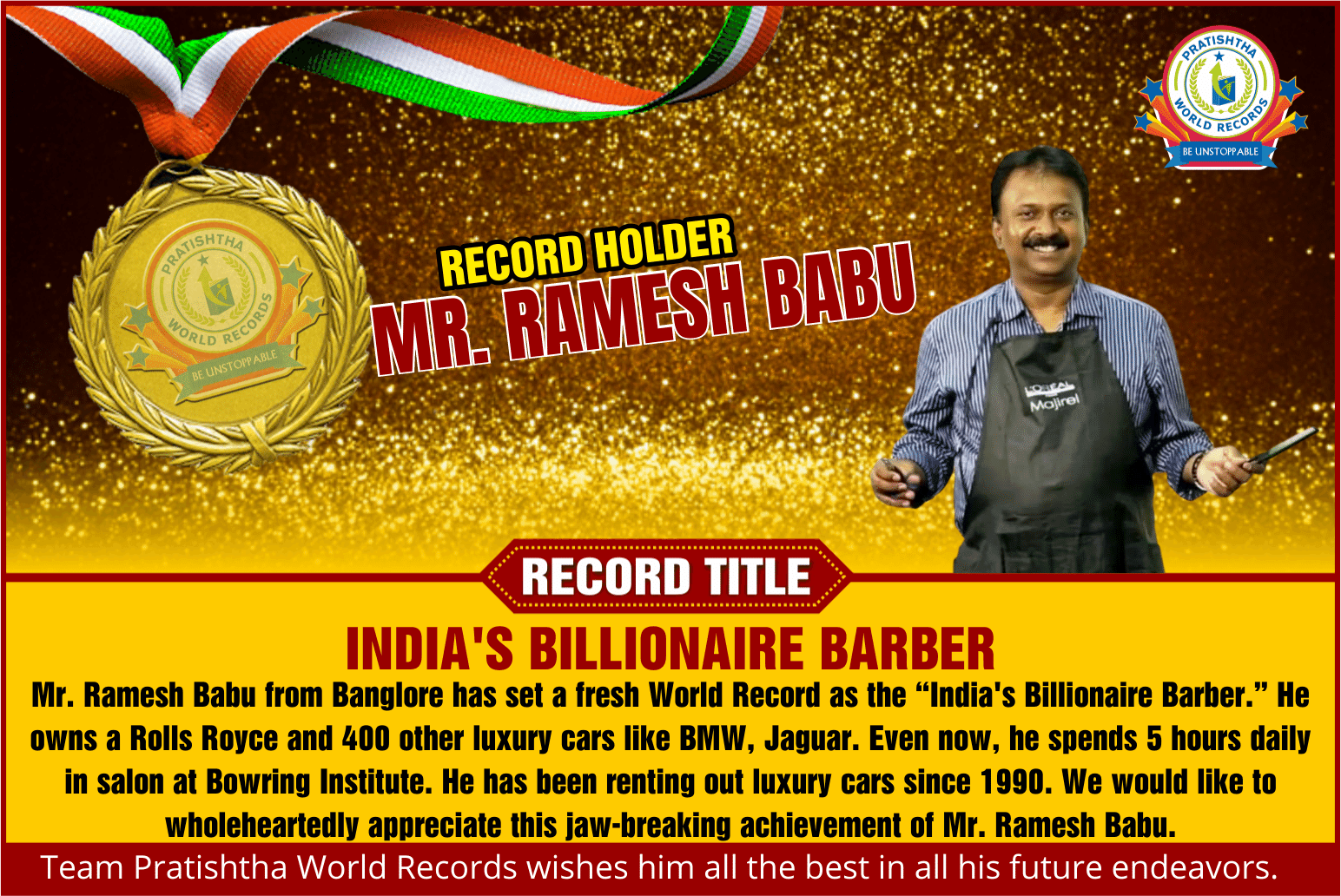 Record Detail: Mr. Ramesh Babu from Banglore has set a fresh World Record as the “India’s Billionaire Barber.” He owns a Rolls Royce and 400 other luxury cars like BMW, Jaguar. Even now, he spends 5 hours daily in-salon at Bowring Institute. He has been renting out luxury cars since 1990. We would like to wholeheartedly appreciate this jaw-breaking achievement of Mr. Ramesh Babu.