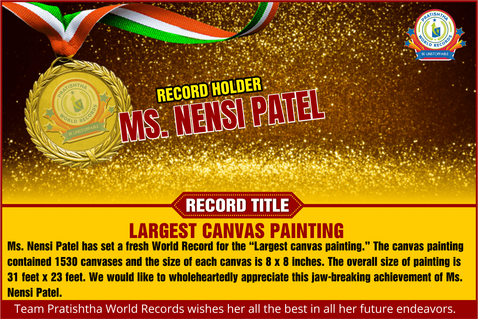 Record Detail: Ms. Nensi Patel has set a fresh World Record for the “Largest canvas painting.” The canvas painting contained 1530 canvases and the size of each canvas is 8 x 8 inches. The overall size of the painting is 31 feet x 23 feet. We would like to wholeheartedly appreciate this jaw-breaking achievement of Ms. Nensi Patel.
