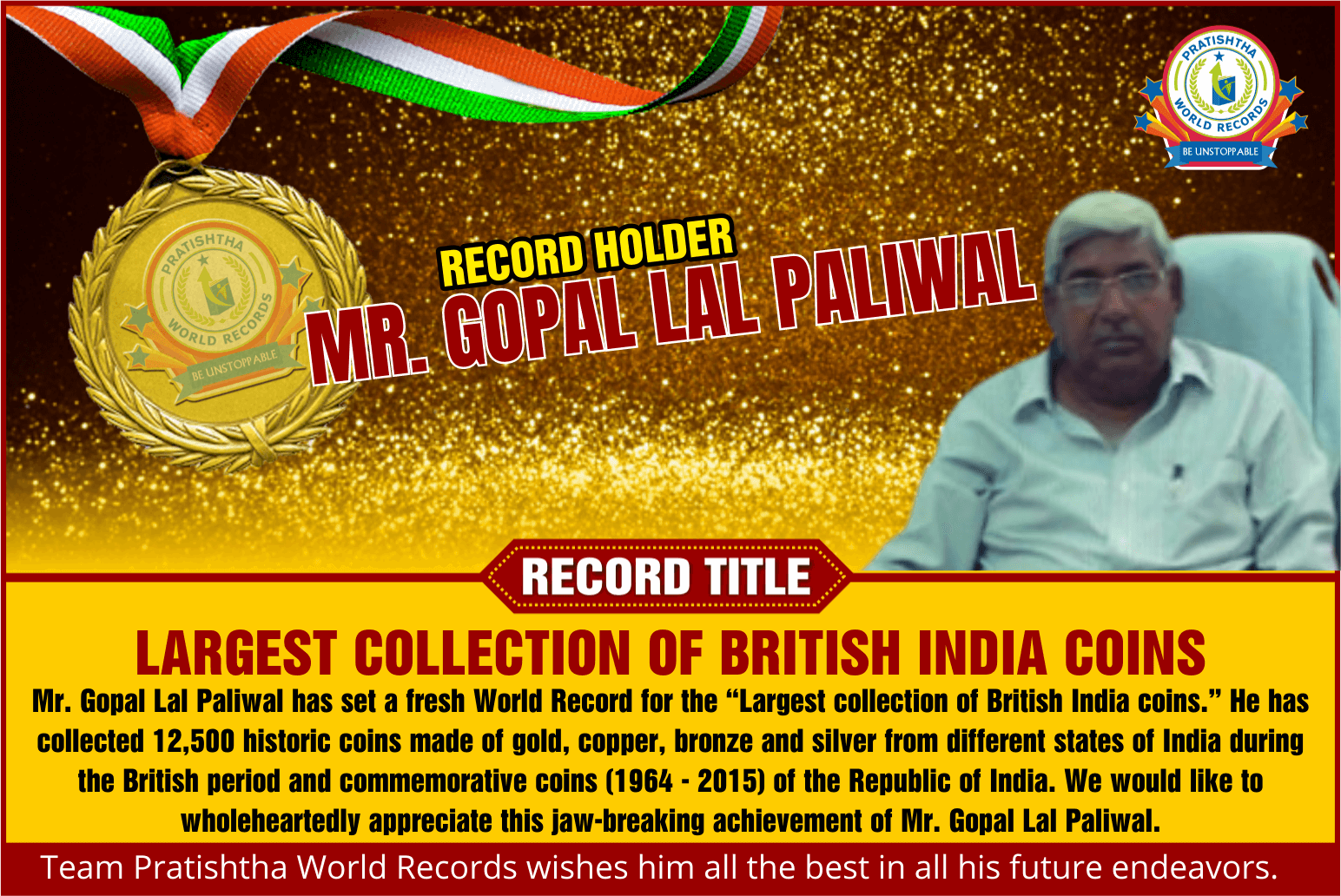 Record Detail:Mr. Gopal Lal Paliwal has set a fresh World Record for the “Largest collection of British India coins.” He has collected 12,500 historic coins made of gold, copper, bronze and silver from different states of India during the British period and commemorative coins (1964 – 2015) of the Republic of India. We would like to wholeheartedly appreciate this jaw-breaking achievement of Mr. Gopal Lal Paliwal.