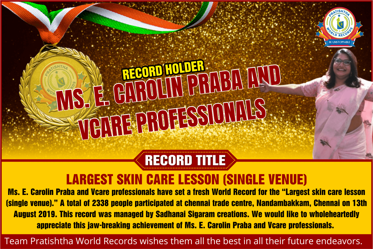 Record Detail: Ms. E. Carolin Praba and Vcare professionals have set a fresh World Record for the “Largest skincare lesson (single venue).” A total of 2338 people participated at Chennai Trade Centre, Nandambakkam, Chennai on 13th August 2019. This record was managed by Sadhanai Sigaram creations. We would like to wholeheartedly appreciate this jaw-breaking achievement of Ms. E. Carolin Praba and Vcare professionals.