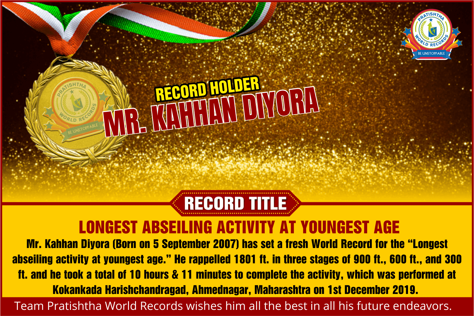 Record Detail: Mr. Kahhan Diyora (Born on 5 September 2007) has set a fresh World Record for the “Longest abseiling activity at youngest age.” He rappelled 1801 ft. in three stages of 900 ft., 600 ft., and 300 ft. and he took a total of 10 hours & 11 minutes to complete the activity, which was performed at Kokankada Harishchandragad, Ahmednagar, Maharashtra on 1st December 2019. We would like to wholeheartedly appreciate this jaw-breaking achievement of Mr. Kahhan Diyora.
