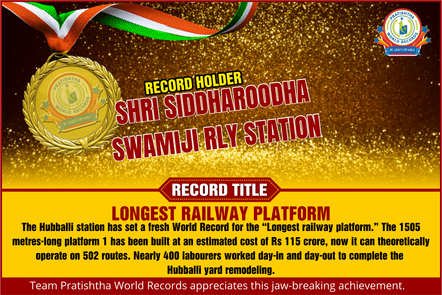 Record Detail: The Hubballi station has set a fresh World Record for the “Longest railway platform.” The 1505 meters-long platform 1 has been built at an estimated cost of Rs 115 crore, now it can theoretically operate on 502 routes. Nearly 400 laborers worked day-in and day-out to complete the Hubballi yard remodeling. We would like to wholeheartedly appreciate this jaw-breaking achievement of Shri Siddharoodha Swamiji Railway Station, Hubballi, Karnataka.