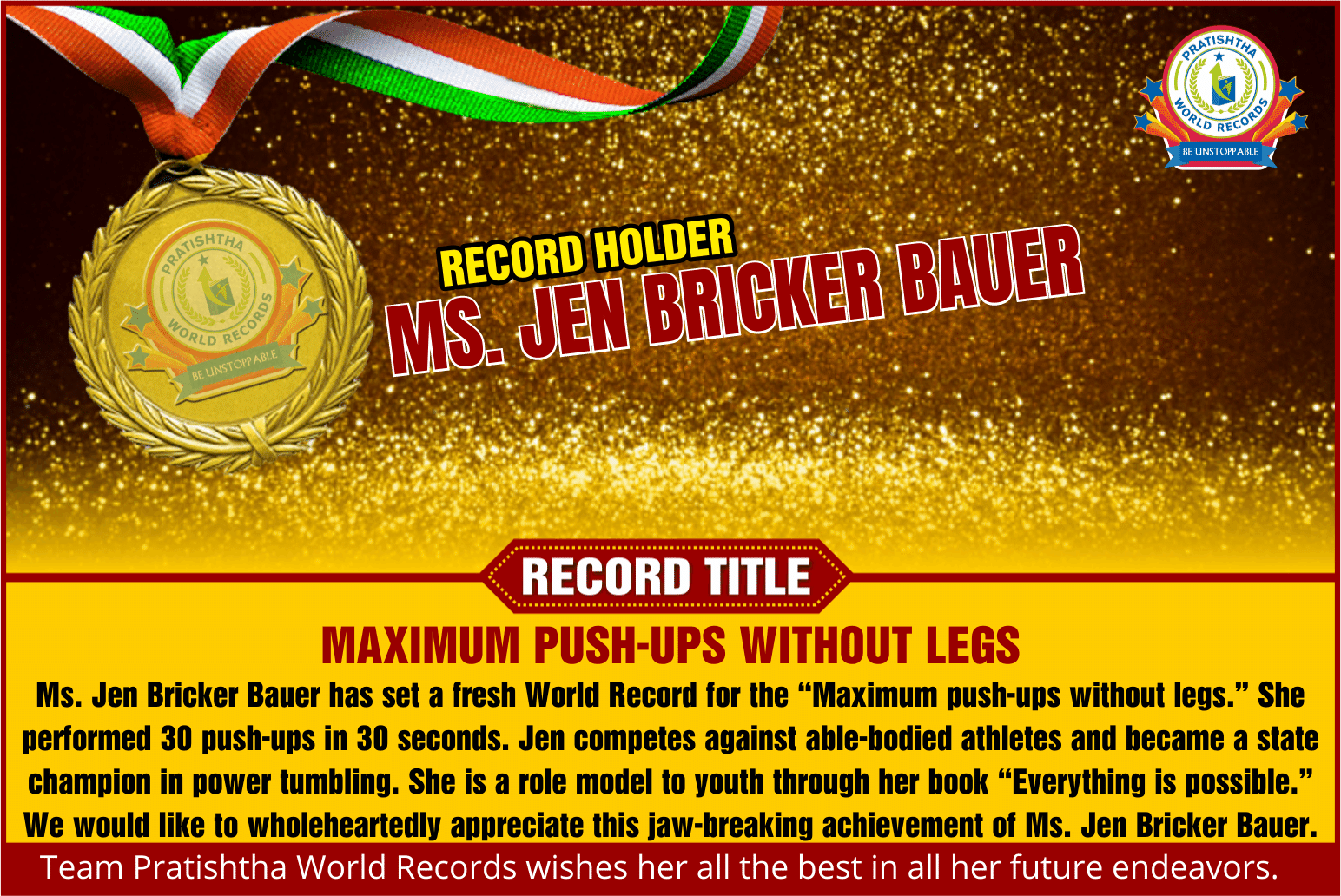 Record Detail: Ms. Jen Bricker Bauer has set a fresh World Record for the “Maximum push-ups without legs.” She performed 30 push-ups in 30 seconds. Jen competes against able-bodied athletes and became a state champion in power tumbling. She is a role model to youth through her book “Everything is possible.” We would like to wholeheartedly appreciate this jaw-breaking achievement of Ms. Jen Bricker Bauer.