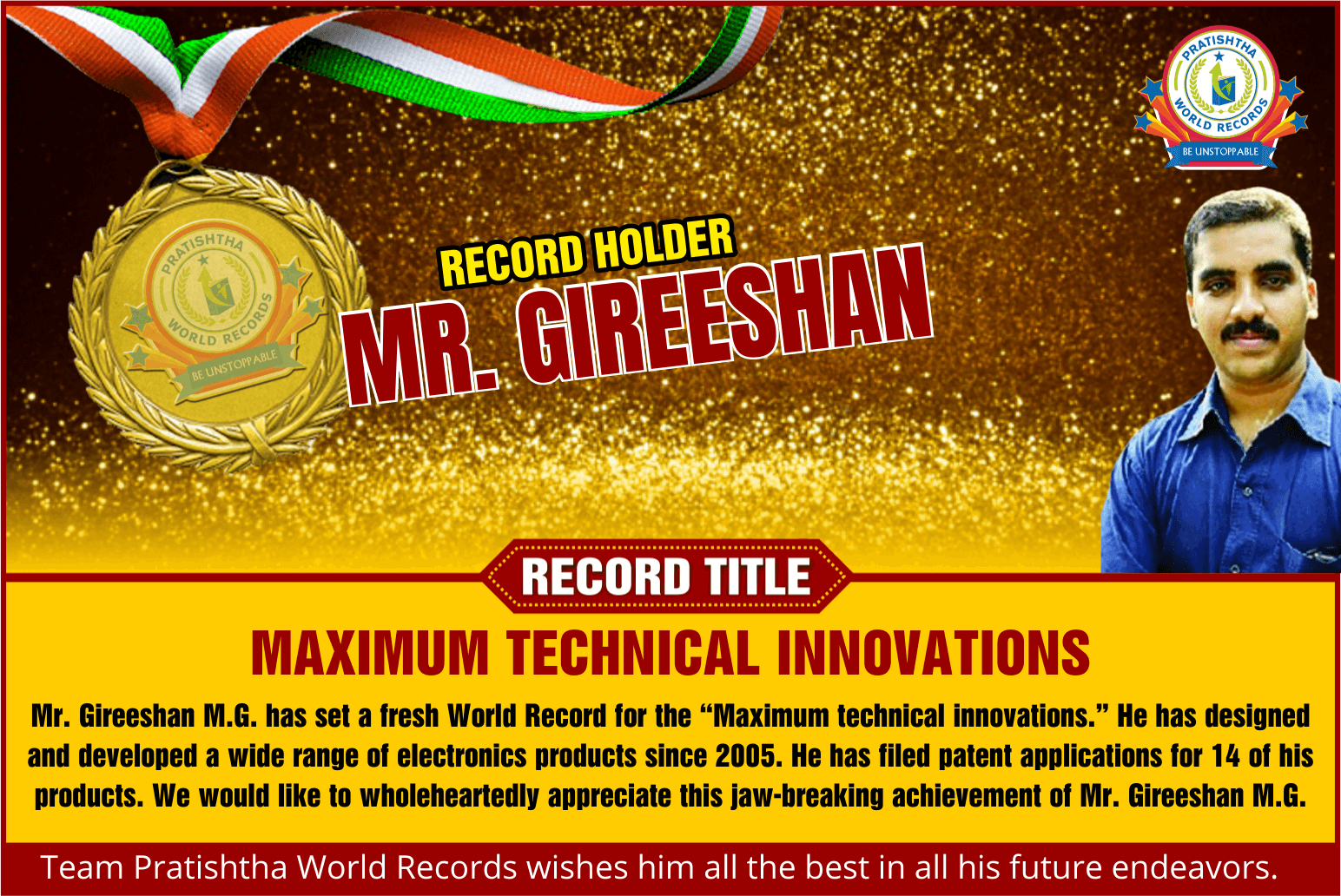Record Detail: Mr. Gireeshan M.G. has set a fresh World Record for the “Maximum technical innovations.” He has designed and developed a wide range of electronics products since 2005. He has filed patent applications for 14 of his products. We would like to wholeheartedly appreciate this jaw-breaking achievement of Mr. Gireeshan M.G.