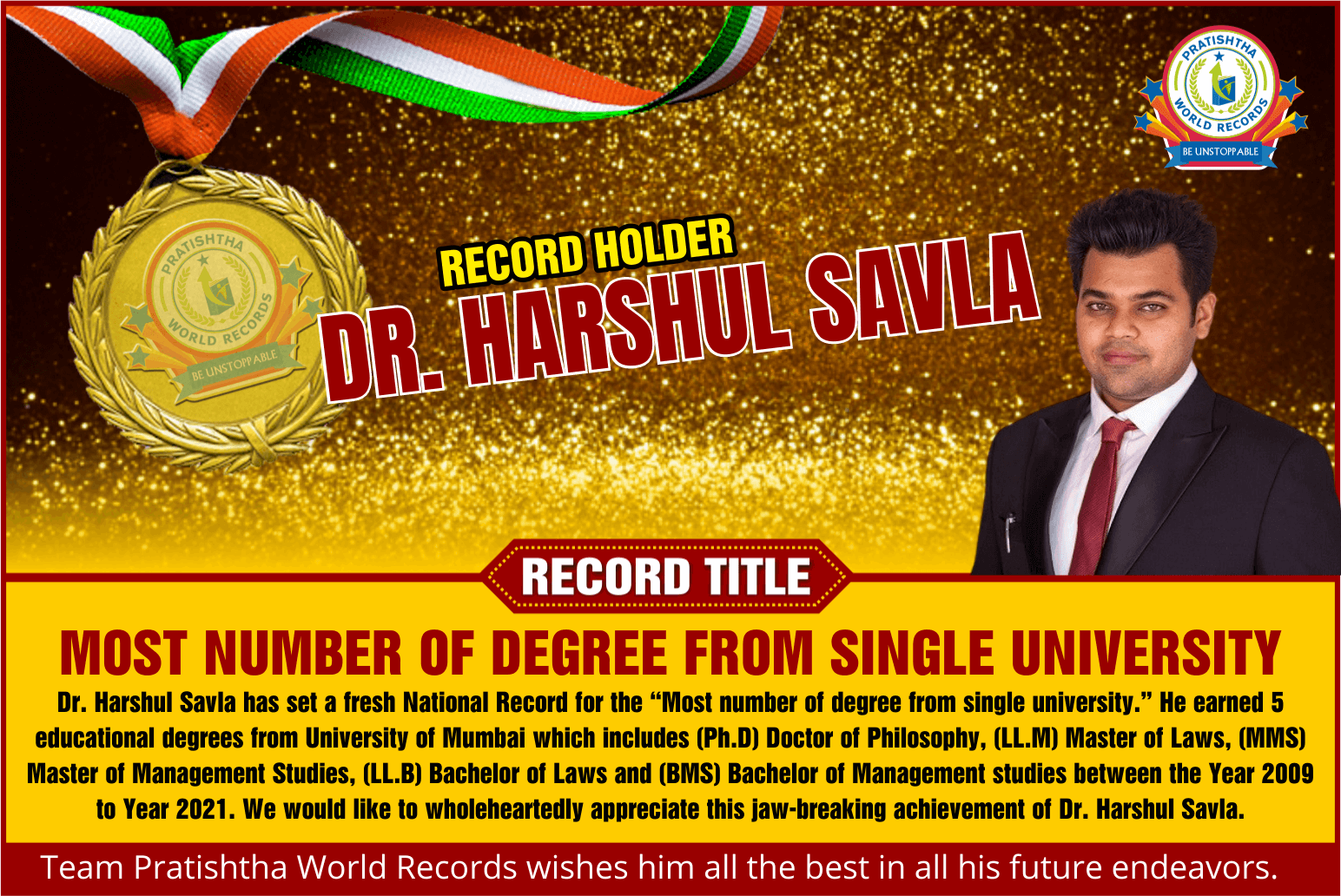 Record Detail:Dr. Harshul Savla has set a fresh National Record for the “Most number of degree from single university.” He earned 5 educational degrees from University of Mumbai which includes (Ph.D) Doctor of Philosophy, (LL.M) Master of Laws, (MMS) Master of Management Studies, (LL.B) Bachelor of Laws and (BMS) Bachelor of Management studies between the Year 2009 to Year 2021. We would like to wholeheartedly appreciate this jaw-breaking achievement of Dr. Harshul Savla.