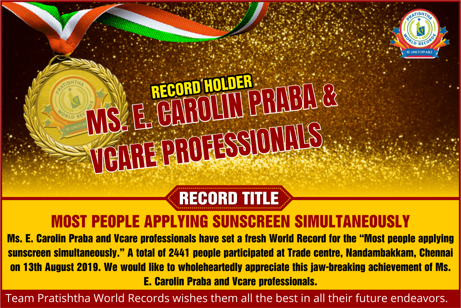 Record Detail: Ms. E. Carolin Praba and Vcare professionals have set a fresh World Record for the “Most people applying sunscreen simultaneously.” A total of 2441 people participated at the Trade centre, Nandambakkam, Chennai on 13th August 2019. We would like to wholeheartedly appreciate this jaw-breaking achievement of Ms. E. Carolin Praba and Vcare professionals.