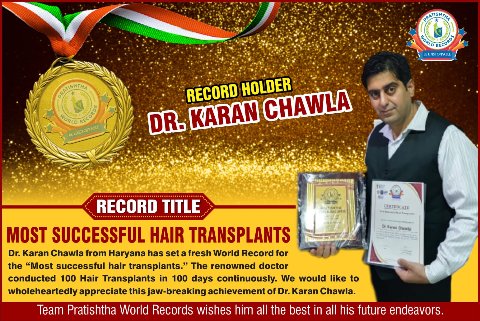 Record Detail: Dr. Karan Chawla from Haryana has set a fresh World Record for the “Most successful hair transplants.” The renowned doctor conducted 100 Hair Transplants in 100 days continuously. We would like to wholeheartedly appreciate this jaw-breaking achievement of Dr. Karan Chawla.