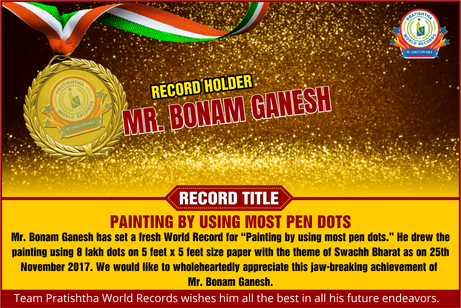 Record Detail: Mr. Bonam Ganesh has set a fresh World Record for “Painting by using most pen dots.” He drew the painting using 8 lakh dots on 5 feet x 5 feet size paper with the theme of Swachh Bharat as on 25th November 2017. We would like to wholeheartedly appreciate this jaw-breaking achievement of Mr. Bonam Ganesh.