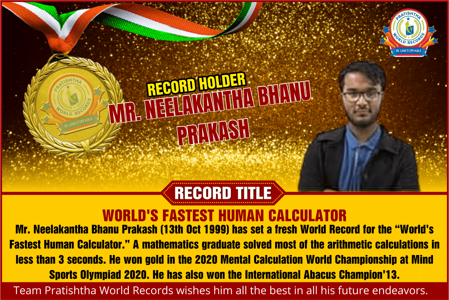 Record Detail: Mr. Neelakantha Bhanu Prakash (13th Oct 1999) has set a fresh World Record for the “World’s Fastest Human Calculator.” A mathematics graduate solved most of the arithmetic calculations in less than 3 seconds. He won gold in the 2020 Mental Calculation World Championship at Mind Sports Olympiad 2020. He has also won the International Abacus Champion’13. We would like to wholeheartedly appreciate this jaw-breaking achievement.