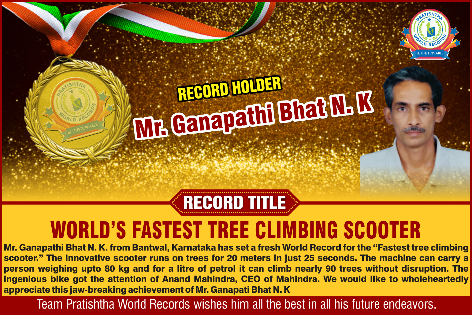 Record Detail: Mr. Ganapathi Bhat N. K. from Bantwal, Karnataka has set a fresh World Record for the “Fastest tree climbing scooter.” The innovative scooter runs on trees for 20 meters in just 25 seconds. The machine can carry a person weighing up to 80 kg and for a litre of petrol it can climb nearly 90 trees without disruption. The ingenious bike got the attention of Anand Mahindra, CEO of Mahindra. We would like to wholeheartedly appreciate this jaw-breaking achievement.