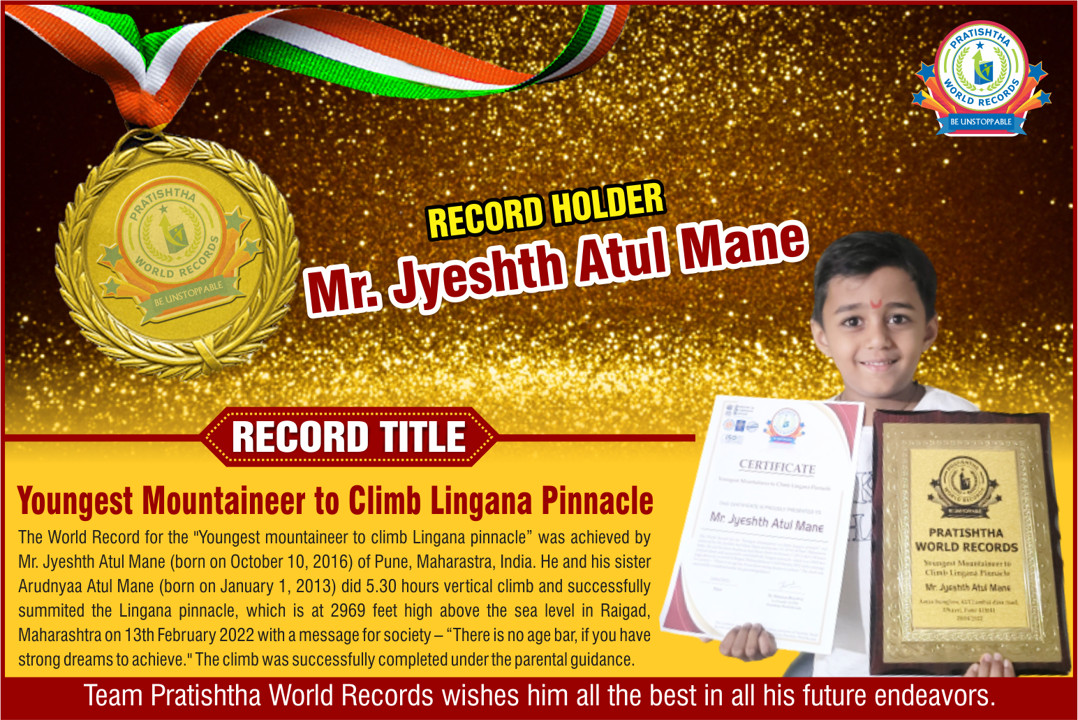 Record Detail: The World Record for the “Youngest mountaineer to climb Lingana pinnacle” was achieved by Mr. Jyeshth Atul Mane (born on October 10, 2016) of Pune, Maharastra, India. He and his sister Arudnyaa Atul Mane (born on January 1, 2013) did 5.30 hours vertical climb and successfully summited the Lingana pinnacle, which is at 2969 feet high above the sea level in Raigad, Maharashtra on 13th February 2022 with a message for society – “There is no age bar, if you have strong dreams to achieve.” The climb was successfully completed under the parental guidance.