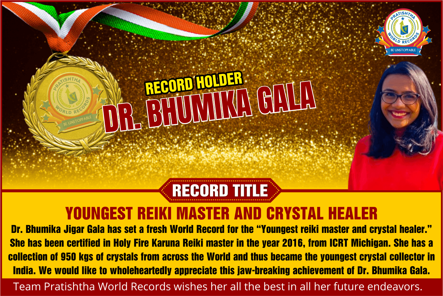 Record Detail: Dr. Bhumika Jigar Gala has set a fresh World Record for the “Youngest reiki master and crystal healer.” She has been certified in Holy Fire Karuna Reiki master in the year 2016, from ICRT Michigan. She has a collection of 950 kgs of crystals from all over the world and thus became the youngest crystal collector in India. We would like to wholeheartedly appreciate this jaw-breaking achievement of Dr. Bhumika Jigar Gala.
