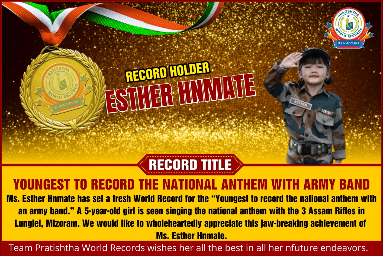 Record Detail: Ms. Esther Hnmate has set a fresh World Record for the “Youngest to record the national anthem with an army band.” A 5-year-old girl is seen singing the national anthem with the 3 Assam Rifles in Lunglei, Mizoram. We would like to wholeheartedly appreciate this jaw-breaking achievement of Ms. Esther Hnmate.